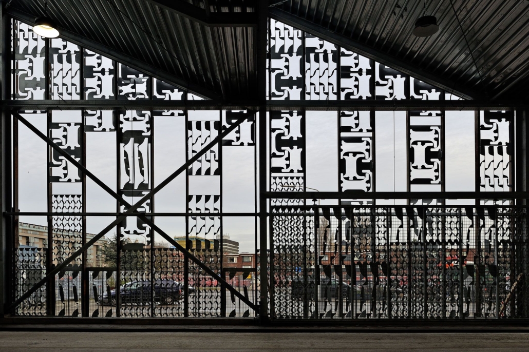 Alle gevels van het gebouw zijn bekleed met voorgelakte, verzinkte staalplaten, afkomstig van de automobielindustrie. Uit de platen zijn eerder onderdelen voor vrachtwagens gesneden. Met de verschillende insnijdingen en perforaties leveren deze ‘contourplaten’ nu vanuit elk gezichtspunt een ander gevelbeeld op. Bovendien verduidelijken de hergebruikte staalplaten de functie van het gebouw: hier lever je je (grof)vuil in.